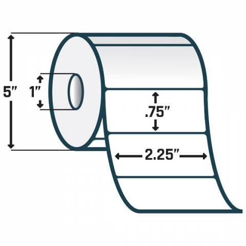 - 2.25" x .75" Paper Label, Perforated, White, 1" Core, 5" OD, 3320 Labels per roll - Case of 6