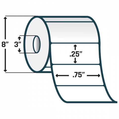 - .75" x .25" Polyestor Label, Perforated, White, 3" Core, 8" OD, 10000 Labels per roll, 4 Labels Across - Case of 4