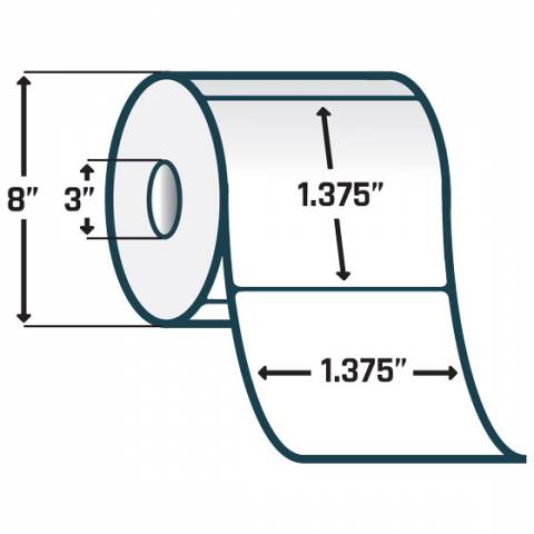 - 1.375" x 1.375" Coated Paper Label, Perforated, White, 3" Core, 8" OD, 4400 Labels per roll - Case of 14