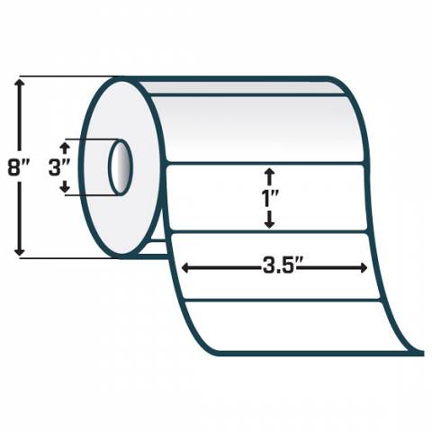 - 3.5" x 1" Paper Label, Non-Perforated, White, 3" Core, 8" OD, 5180 Labels per roll - Case of 6