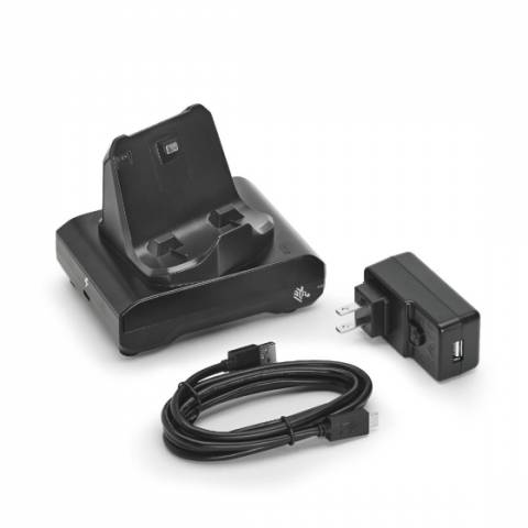 Docks and charges a single ZQ300 series printer, and also includes a USB cable and an AC to USB adapter.