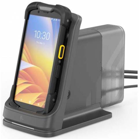 The workstation Connect Cradle is an enhanced single slot charging cradle allowing users to use the Zebra TC73 / TC78 device as a workstation or kiosk.