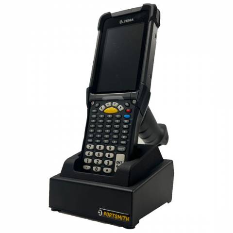 This Portsmith Single Slot Ethernet Cradle Kit with Power Supply enables ethernet communication for a Zebra MC9300 or MC9400 barcode scanner while also charging at the same time.